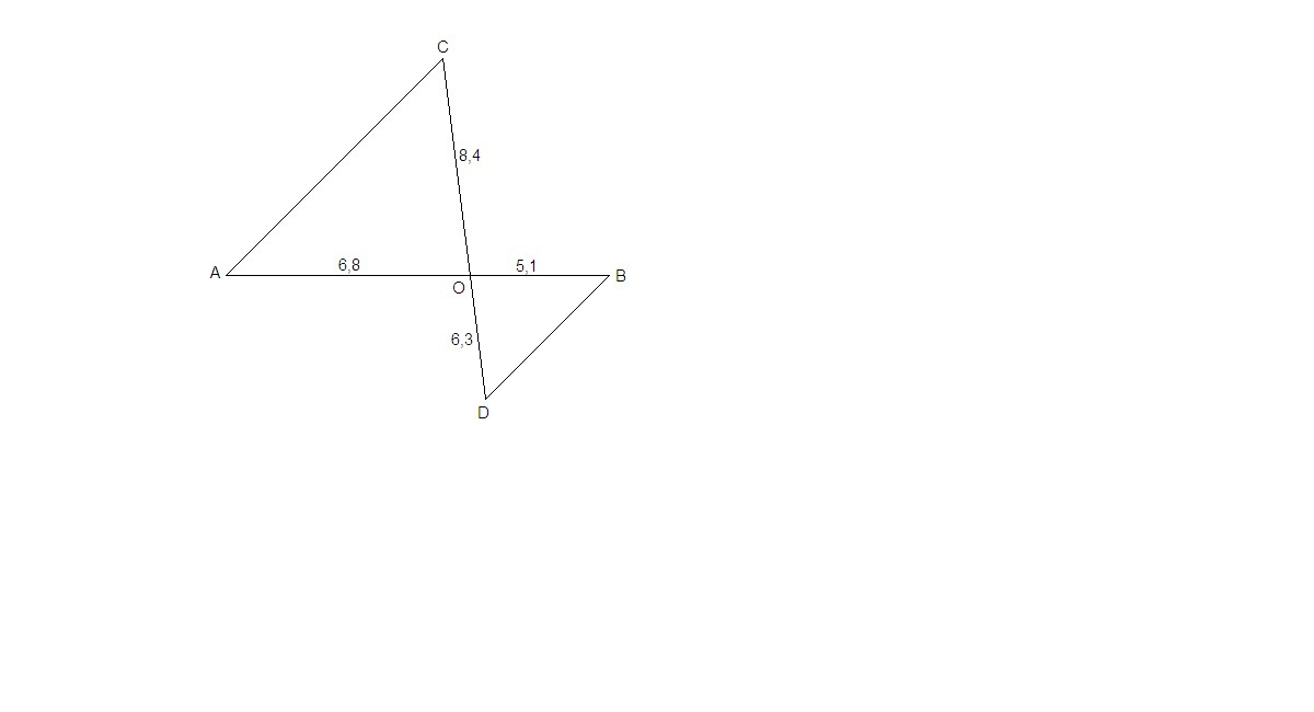 АО=6,8 CO=8.4 OB=5.1 OD=6.3. Дакозать что АС параллельно ВД. Найти : а)ВД:АС ; б)отношение периметров треугольников АОС и ДОВ; в) отнашение площадей треугольников ДОВ и АОС