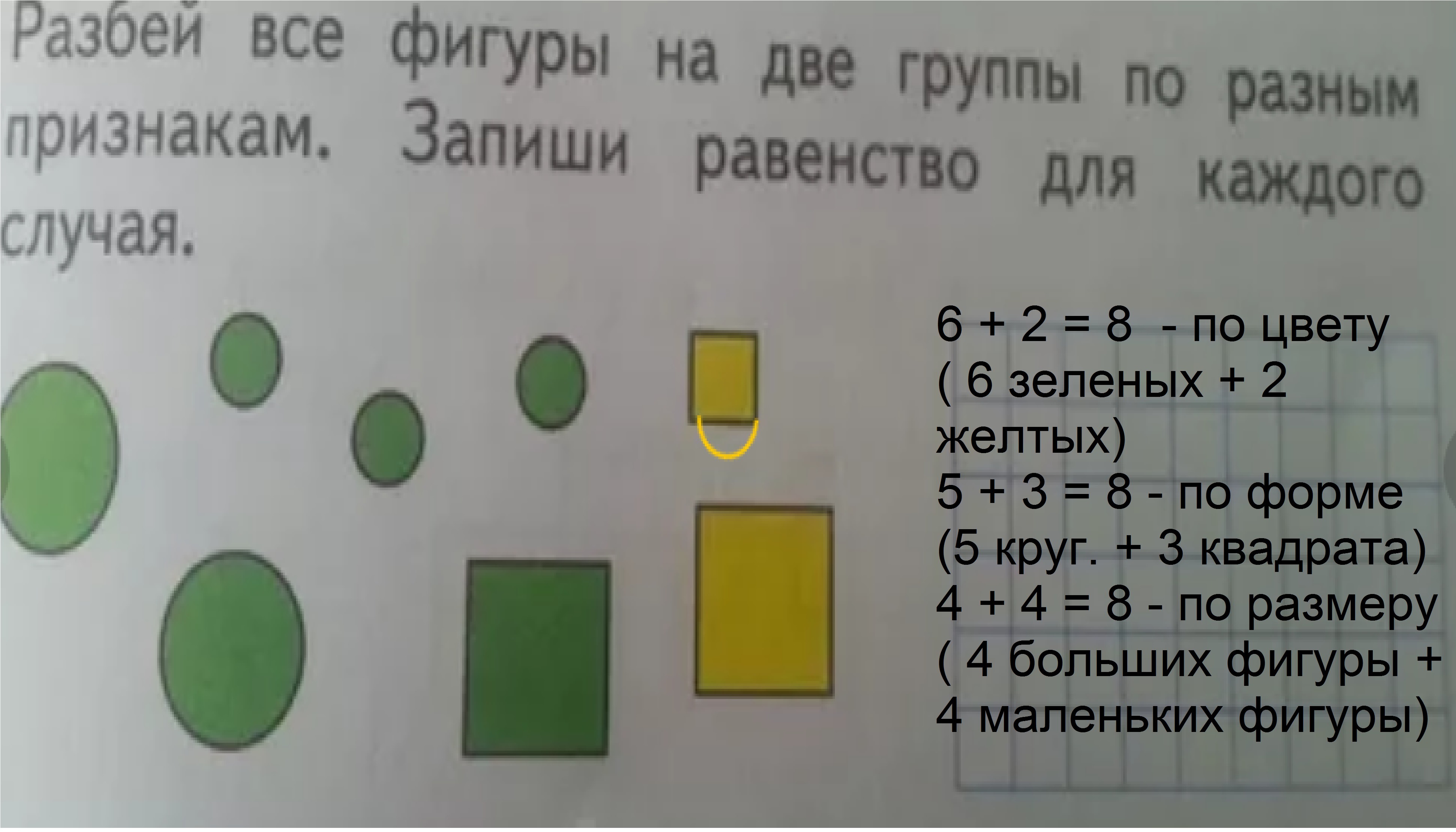 помогите пожалуйста. Разбей все фигуры на две группы по разным признакам. Запиши равенство для каждого случая. (НАРИСОВАНО: два больших круга-зеленые и три маленьких круга-зеленые, один маленький квадрат-желтый и один большой квадрат-желтый, один большой квадрат-зеленый)