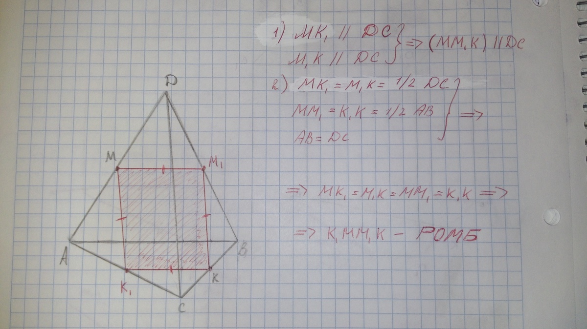 В тетраэдре DABC точка M и K - середины рёбер DA и BC. Постройте сечение тетраэдра ,проходящее через точки M и K параллельно прямой DC. Определите вид построенного сечения. Пожалуйста, с полным оформлением и чертежом