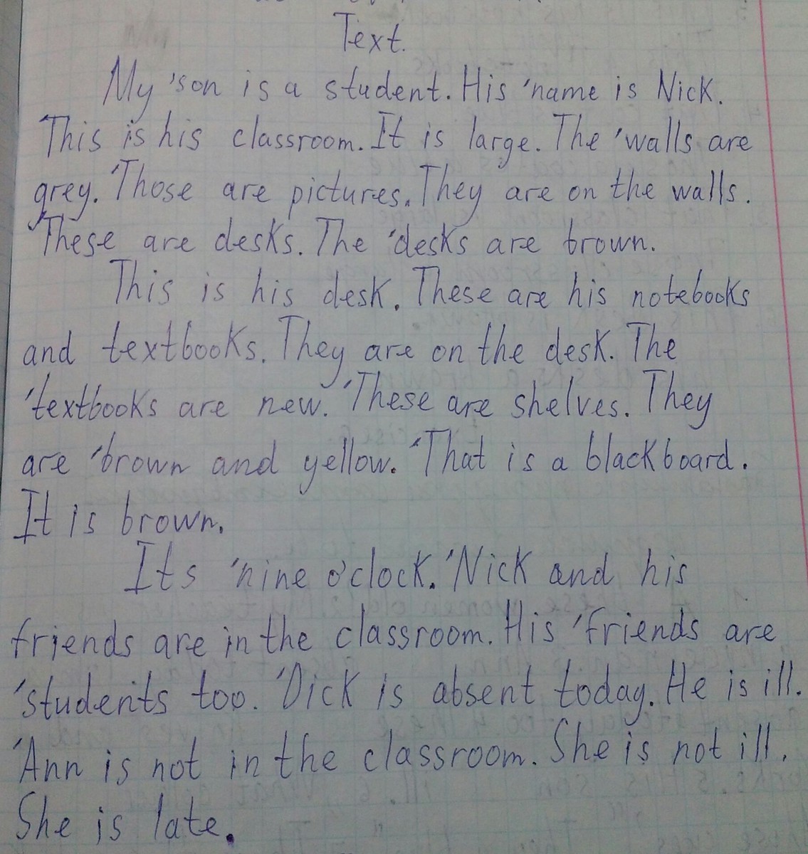 Это его парта. Это - его тетради и учебники. Они лежат на парте. Учебники - новые. Это - полки. Они коричневые и жёлтые. Это - доска. Она коричневая.