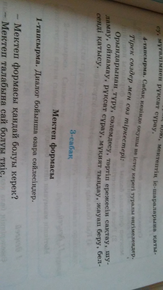 Оқушы сабаққа кіргенде ұстазга сәлемдесуі тиіс. озге окытушылар кіргенде оқушылар орнынан туруы керек.Узилис кезінде балалар шуламай,тартип ережесін сактауы керек.Сабакта ойнамай, балаларга бир нарсе айтпас бурын, мугалимнен руксат сурауы тиис.Сабакты мукият тындап, мугалимнин сурактарына жауап кайтаруыне миндетти.Сабакка белсенді катысу да керек
