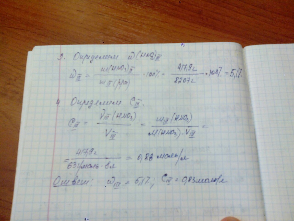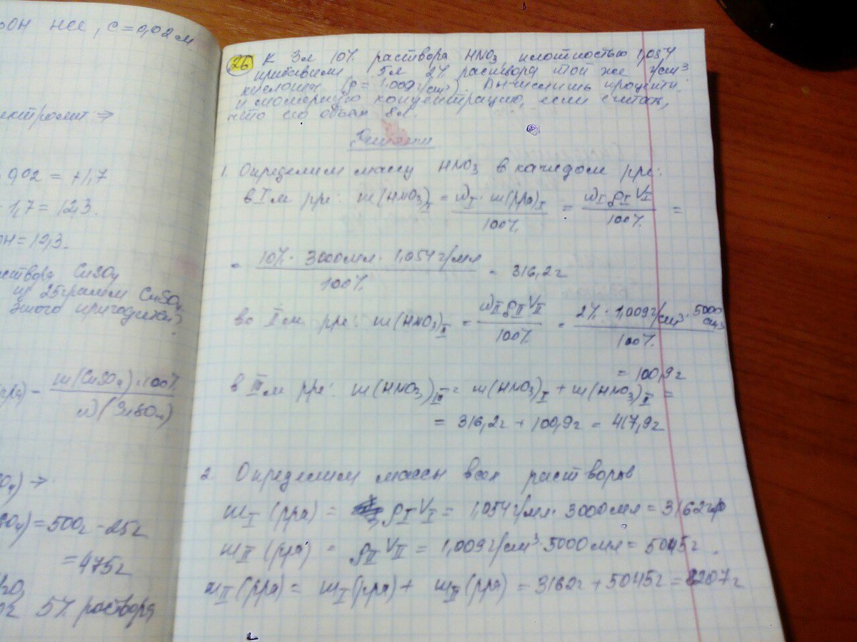 к трем литрам 10% раствора HNO3, плотность которого 1,054 г/см3, прибавили 5 л 2% раствра той же кислоты с плтностью 1,009 г/см3. вычислите процентную и молярную концентрации полученного раствора, если считать, что его объем равен 8 л.