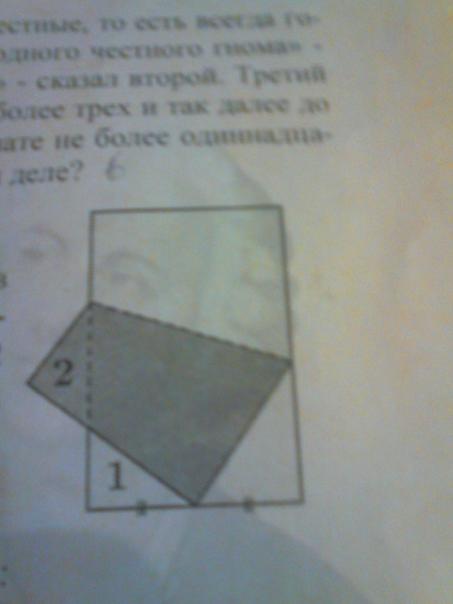 Прямоугольный лист бумаги согнули совместив вершину с серединой противоположной короткой стороны(смотри рисунок).Оказалось,что треугольник 1 и 2