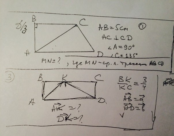 1)угол САД=45 градусов как внутренний накрест лежащий с углом АСД (135-90=45). Треугольники АВС и АСД равнобедренные прямоугольные. АВ=ВС=5, АС=5 корней из 2. Из треугольника АСД АД=10. MN=(5+10):2=7,5