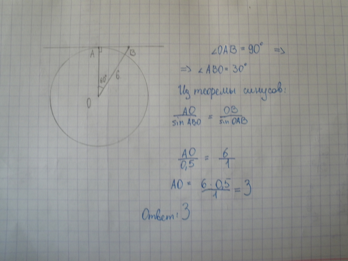 Через точку А окружности с центром О проведена касательная АВ .найдите радиус окружности,если ОВ=6,угол АОВ=60градусов.