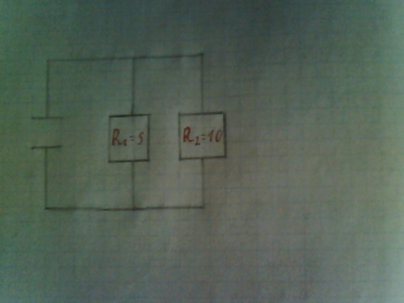 Два проводника сопротивлением 5 и 10 Ом присоединены параллельно к источнику тока напряжением 20 В. Начертите схему соединения проводников. Определите силу тока в каждом проводнике и общую силу тока в цепи.