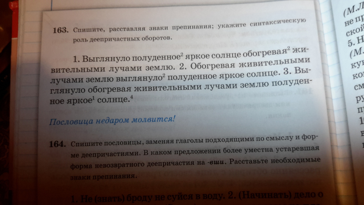 Выглянуло полуденное яркое солнце, обогревая живительными лучами землю. 2. Обогревая живительными лучами землю, выглянуло полуденное яркое солнце. 3. Выглянуло, обогревая живительными лучами землю, полуденное яркое солнце.