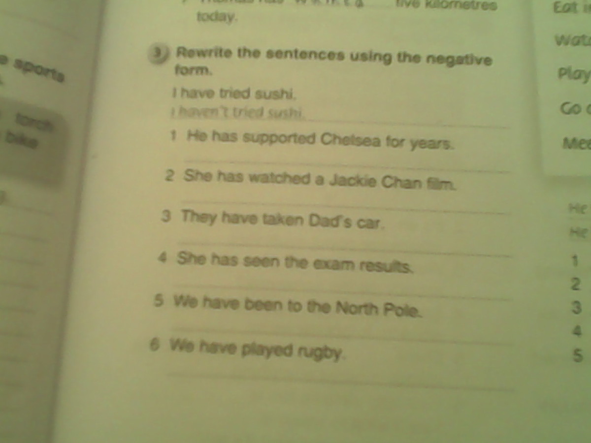 He hasn't suporter Chelsea for years. 2. She hasn't watch a Jackie Chan film. 3.They haven't Take dad's car. 4. She hasn't SEE the exam results. 5. We haven't we're to the north pile. 6. We haven't play rugby.
