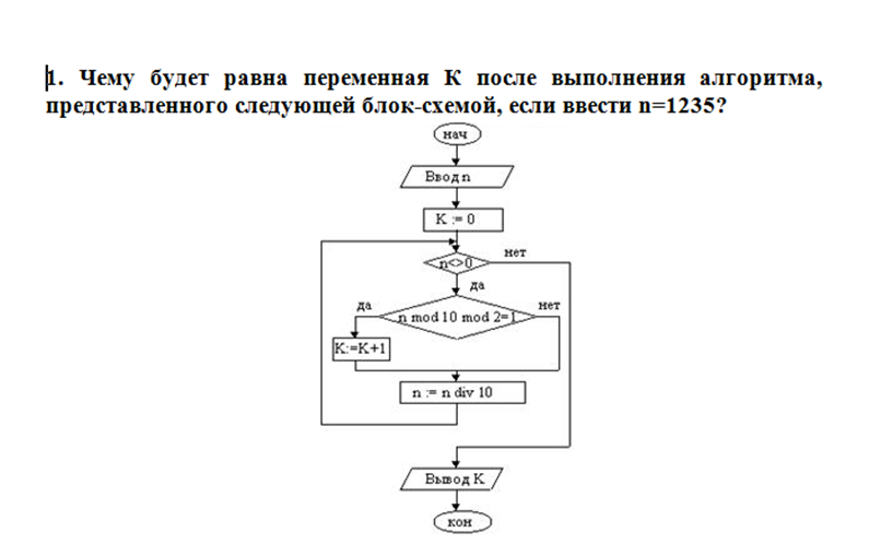 Чему будет равна переменная К после выполнения алгоритма, представленного следующей блок-схемой, если ввести n=1235?