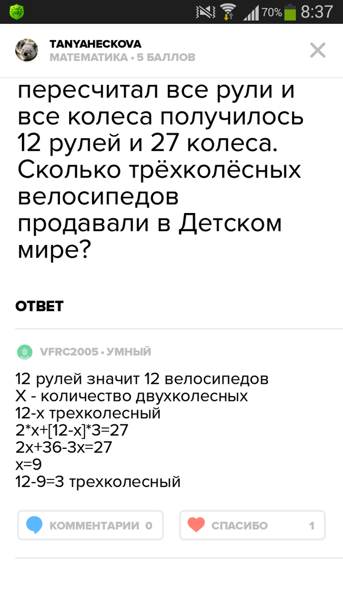 В Детском мире продавали двухколёсные и трёхколёсные велосипеды. Миша пересчитал все рули и все колёса.Получилось 12 рулей и 27 колёс. Сколько трёх колёсных велосипедов продавали в Детском мире? Решите пожалуйста с действиями и пояснениями.))))