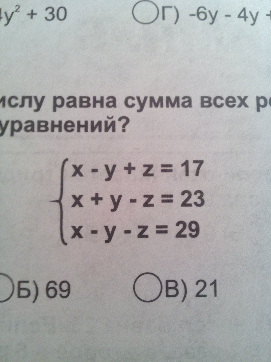 Другой способ: 1) умножив 3 уравнение на -1,имеем -х+у+z=-29; 2) почленно складывая все три уравнения сразу получим ответ x+y+z=11.