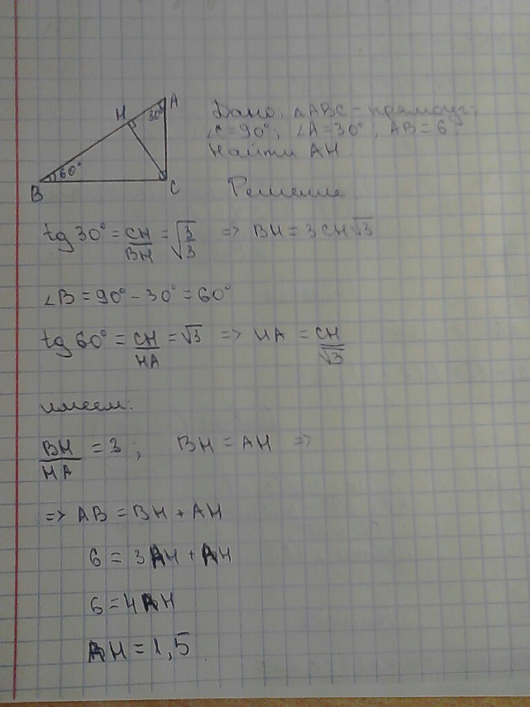 В прямоугольном треугольники АВС с прямым углом С СН- высота , угол А равен 30 градусов , АВ=6 . Найдите АН