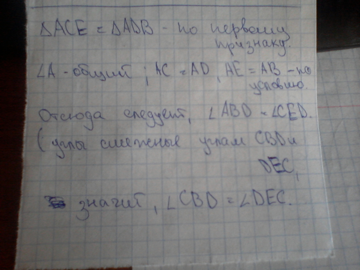 Помогите плиззз.На сторонах угла САD отмечены точки B и E так,что точка B лежит на отрезке AC,а точка E-на отрезке AD,причем ACD=ADC,AC=AD и AB=AE.Докажите,что CBD=DEC