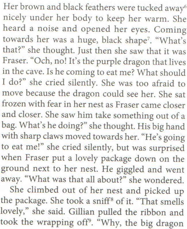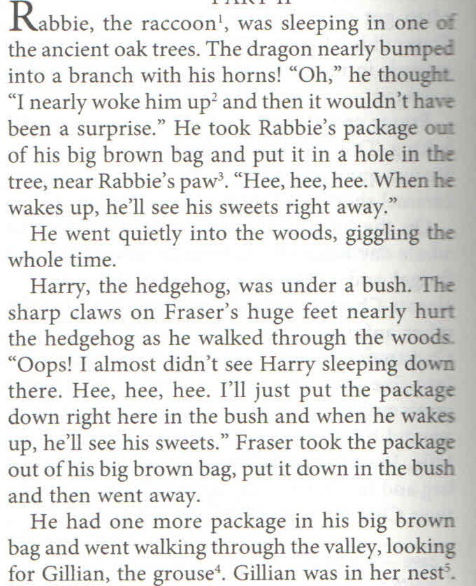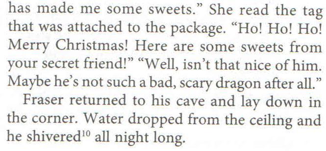 Ёж Гарри находился под кустом. Острые клыки на огромной лапе Фразера чуть не поцарапали ежа, когда он проходил мимо него в лесу. «Упс, еще бы чуть-чуть, и я бы не заметил спящего здесь Гарри. Хи-хи-хи. Я просто положу сверток прямо здесь, в кустах, и, когда он проснётся, он увидит свои сладости». Фразер вытащил свёрток из своей большой коричневой сумки, положил его в кустах и ушел. У него в большой коричневой сумке был еще один свёрток, и он пошел по долине в поисках гуся Джилиан. Джилиан находилась в своём гнезде. Ее черно-коричневые перья были хорошо спрятаны под ее туловище для того чтобы сохранять тепло. Она услышала шум и открыла глаза. К ней приближалась большая черная фигура. «Что это?», подумала она. Потом она увидела, что это был Фразер. «О, нет! Это фиолетовый дракон, который живет в пещере. Он пришел, чтобы съесть меня? Что же мне делать», - тихо заплакала она Она боялась двигаться, потому что дракон мог увидеть её. Она сидела, скованная страхом в своем гнезде, пока Фразер подходил все ближе и ближе. Она увидела, что он вынимает что-то из сумки. «Что он делает», - подумала она. Его большая лапа с острыми когтями потянулась к ней. «Он собирается съесть меня», тихо заплакала она, но она удивилась, когда Фразер положил красивый свёрток на землю рядом с её гнездом. Он захихикал и ушёл. «И что это все значит», удивилась она. Она вылезла из своего гнезда и взяла сверток. Она понюхала его. «Пахнет приятно», - сказала она. Джилиан потянула за ленточку и сняла обёртку. «Зачем большой дракон сделал для меня конфеты?». Она прочла надпись на этикетке, прикреплённой к свёртку. «Хо-хо-хо! Весёлого Рождества! Это тебе сладости от тайного друга!». «Это так мило с его стороны. Может, после всего этого, он не такой уж и плохой и страшный дракон». Фразер вернулся в свою пещеру и лёг в углу. Вода капала с потолка, и он всю ночь дрожал от холода.