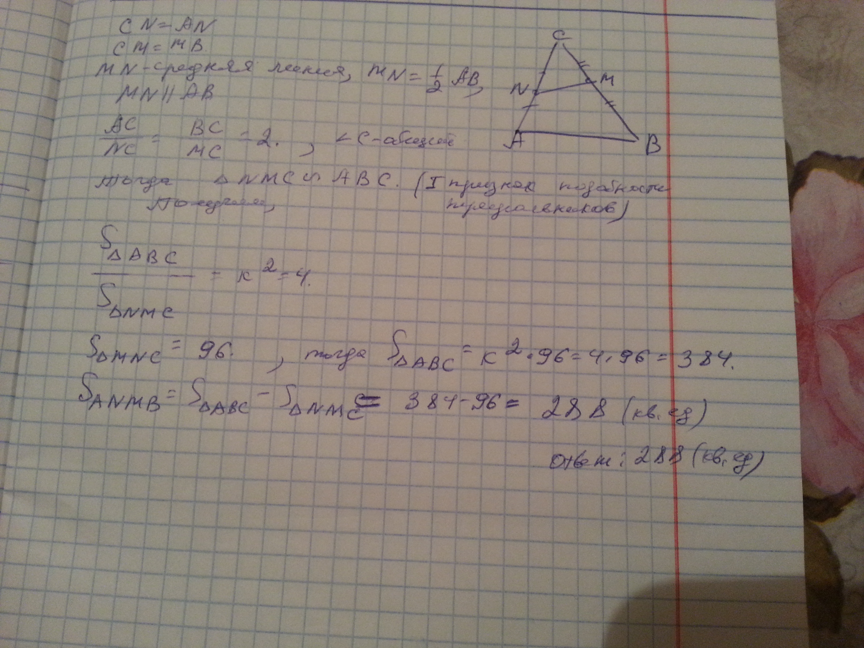 В треугольнике ABC отмечены середины M и N сторон BC и AC соответственно. Площадь треугольника CNM равна 96. Найдите площадь четырехугольника ABMN.
