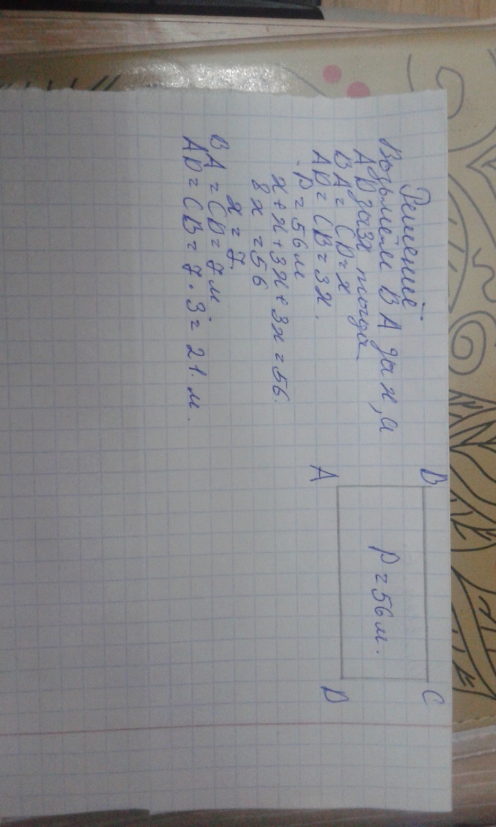 Определите измерение прямоугольника учитывая что: одно из них в 3 раза больше другого, а периметр прямоугольника равен 56 метров