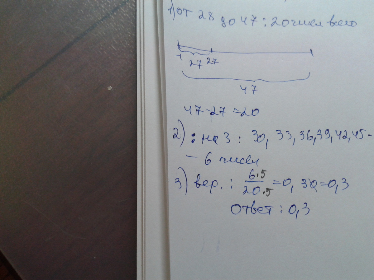 из множества натуральных чисел от 28 до 47 наудачу выбирают одно число. Какова вероятность того, что оно делится на 3?