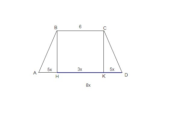 В равнобедренной трапеции высота, проведённая из вершины тупого угла, делит большее основаниев отношение 5:8. Меньшее основание трапеции равно 6 см. Найти стреднюю линию трапеции.