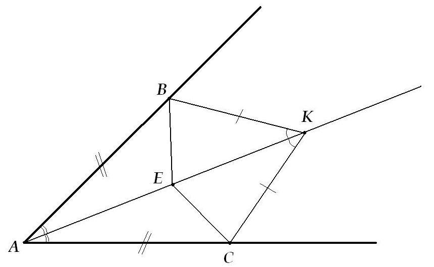 Начертите угол А. На его сторонах отложите отрезки AB иAC, AB=AC. Проведите биссектрису углаA. На этом луче обозначьте две любые точки буквамиE и K так, чтобы точка E принадлежала отрезку AK. Докажите , что треугольники EBK и ECK равны. Ребяят, срочно, до завтра, прошу вас
