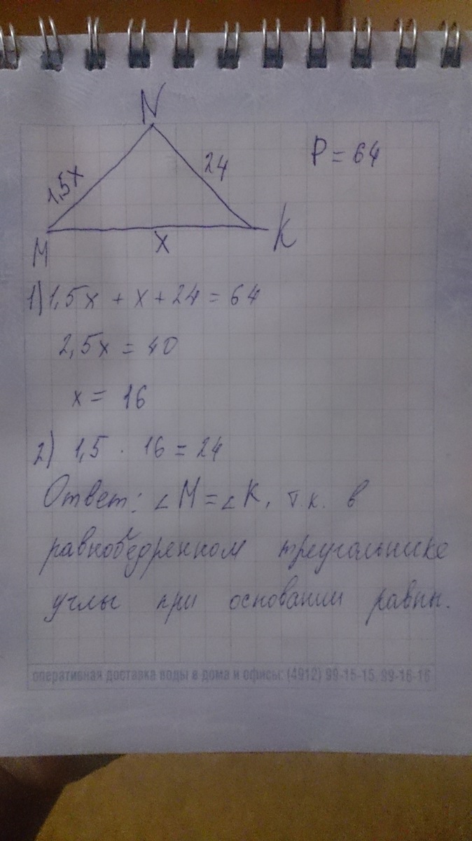 Периметр теугольника MNK равен 64 см, NK=24 см, а MK в 1,5 раза меньше MN. Докажите, что угол M= углу K.