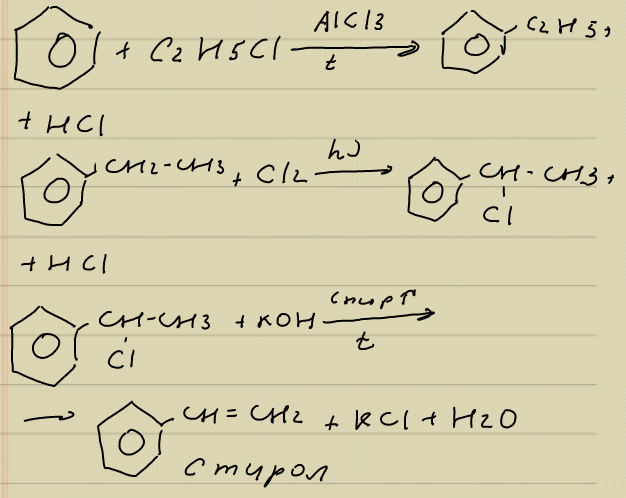 C6H6------(C2H5Cl,AiCl3 на стрелах)--------> X1 --------(Cl2,hv на стрелах)----------> X3 --------(KOH,C2H5OH на стрелах)-------->
