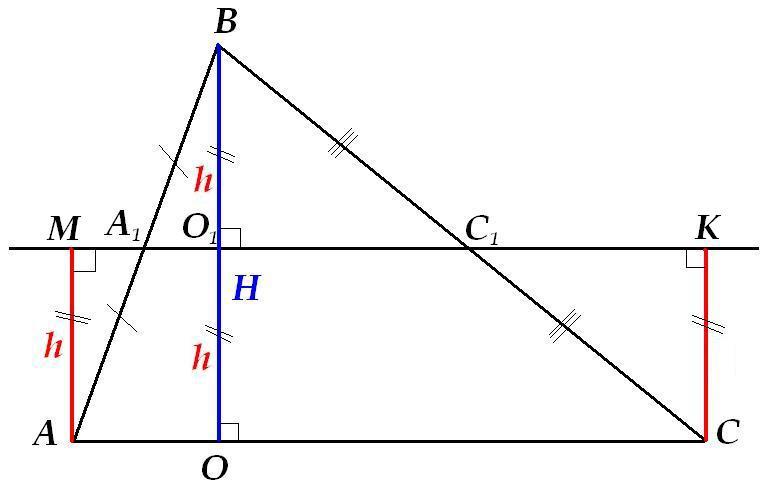 докажите, что вершины треугольника находяся на одинаковом расстоянии от прямой, проходящей через его среднюю линию. помогите пожалуйста!!!