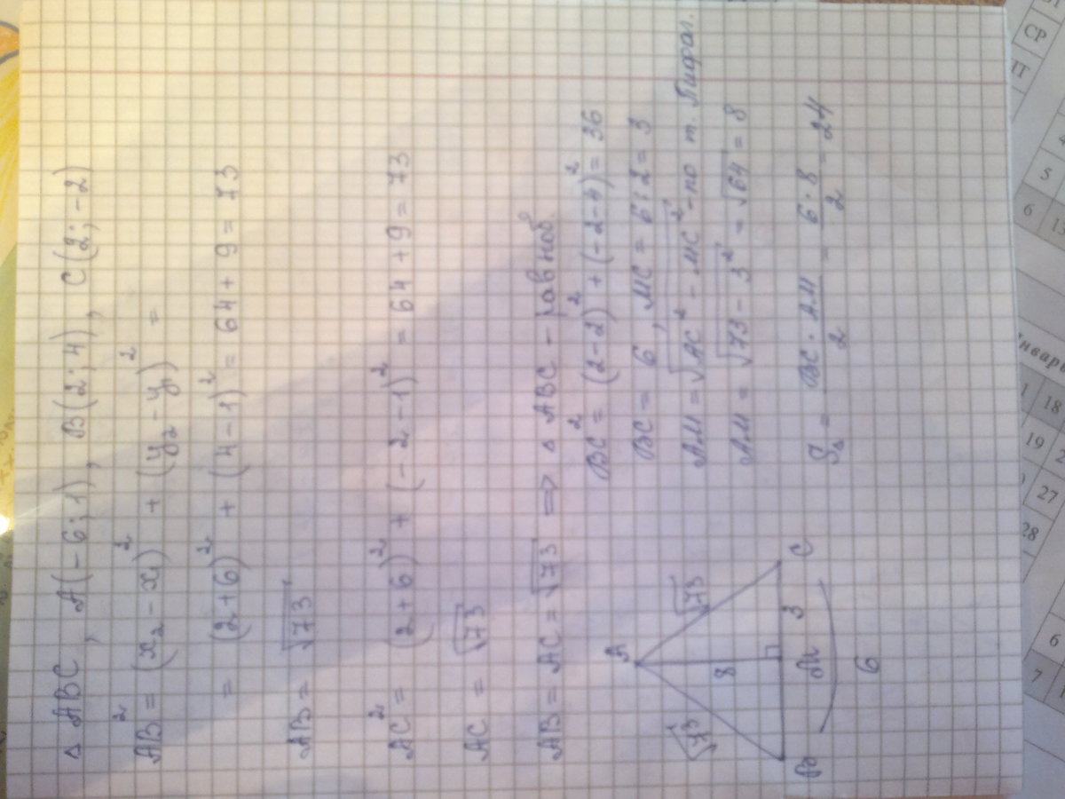 Даны координаты вершин треугольника ABC,если А(-6;1),В(2;4) и С(2;-2).Докажите,что треугольник равнобедренный и найти высоту треугольника, проведенную из вершины А.Найти площадь треугольника.