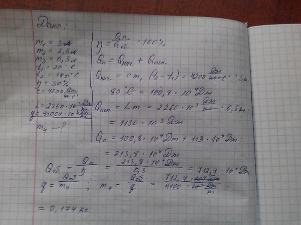 На газовую плиту поставили чайник, вмещающий 3 Л воды при 20 градусов по Цельсию. Какое количество природного газа было израсходовано, если после кипячения в чайнике оказалось 2,5 литра кипятка? КПД плиты 30 процентов.