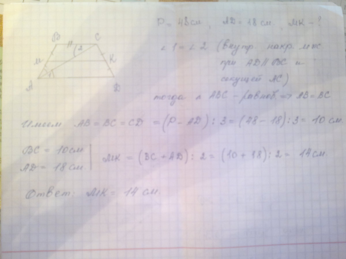 Диагональ равнобедренгой трапеции является биссектрисой острого угла. Найдите среднюю линию трапеции , если ее периметр равен 48 см, а большее основанте равно 18 см.