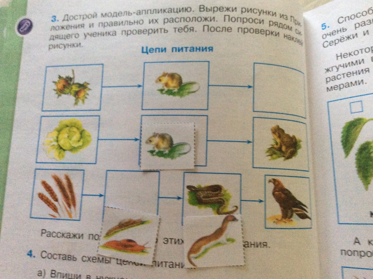 Нужно составить цели питания. Вторую цепь я сделала. Ну я думаю что так должно быть. А вот первое и третье...поможете? Внизу 2 картинки предложенных животных. Нужно их расставить.