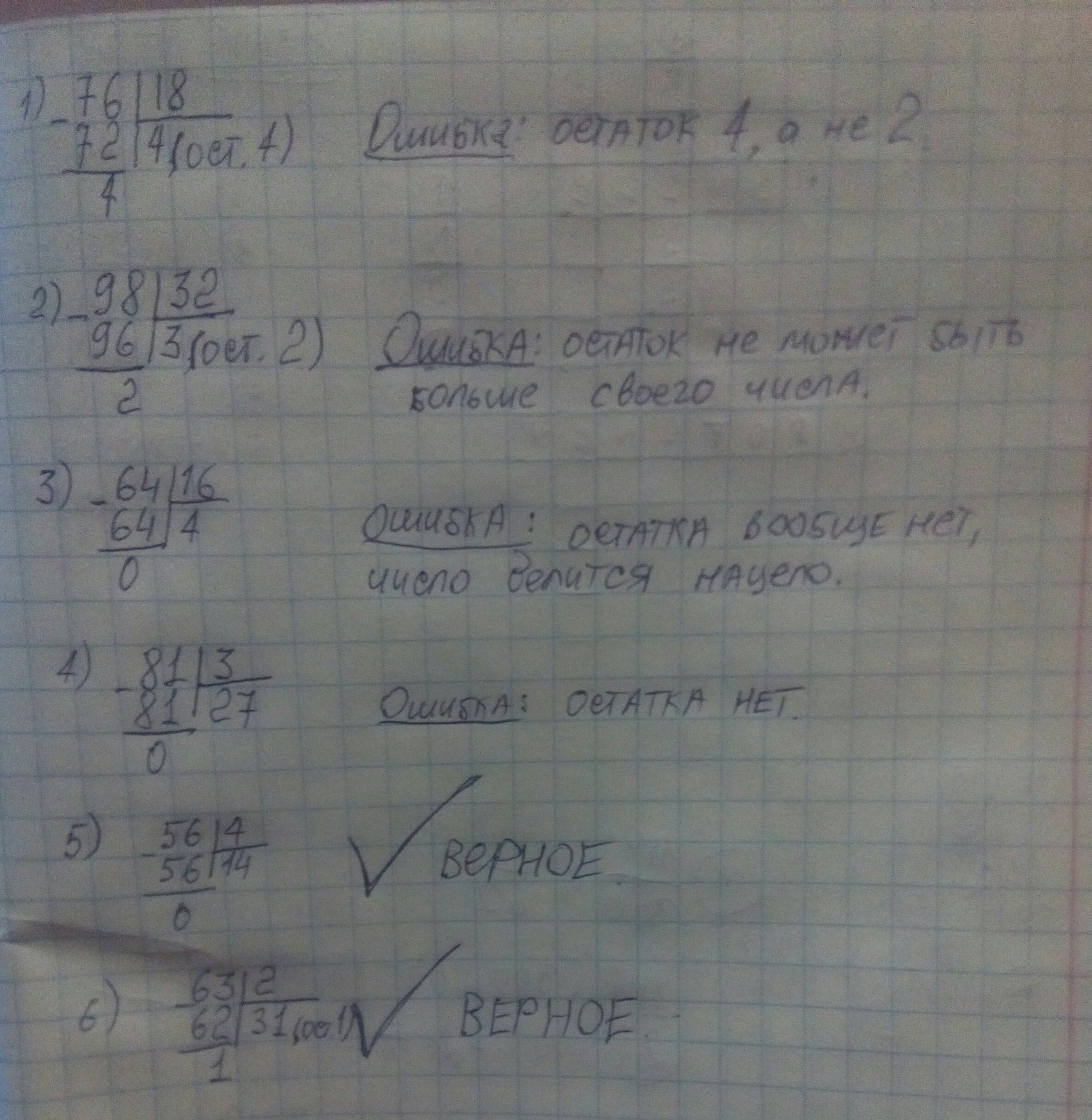 Найдите ошибки в записях гнома Вени и устно исправьте их 76:18=4(ост 2)