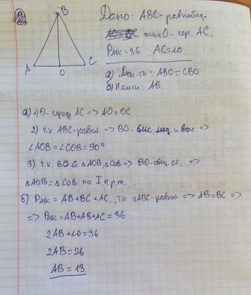 Дано: треугольник ABC равнобедренный. AC основание точка O середина AC