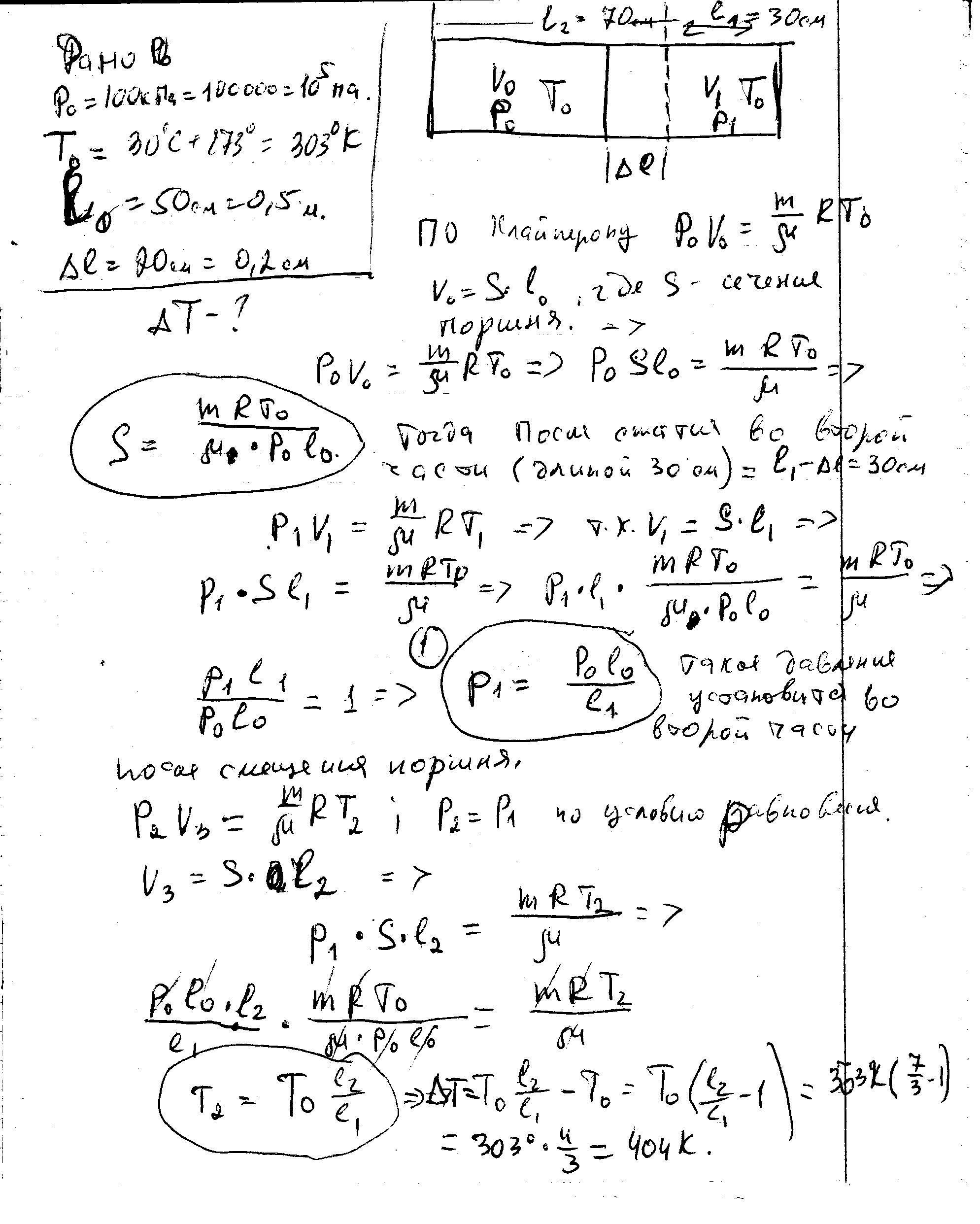 Закрытый с обоих концов цилиндр наполнен газом при давлении 100 кПа и температуре 30 С и разделен легкоподвижным поршнем на две равные части длиной по 50 см. На какую величину ΔТ нужно повысить температуру газа в одной половине цилиндра, чтобы поршень сместился на расстояние 20 см, если во второй половине цилиндра температура не изменилась.