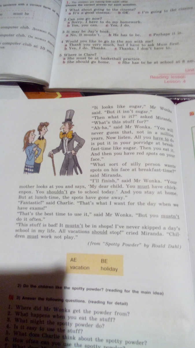 Это выглядит как сахар, сказал мистер Вонка. Но это не сахар. Тогда что это? Спросила Миранда. Что это за вещи? Ах-ха,сказал мистер Вонка. Вы никогда не догадаетесь, что не в миллион лет сейчас слушают.Все, что вам нужно сделать, это положить ему в кашу при разрыве-быстро время как сахар.Затем вы едите его. И тогда у вас появятся красные пятна на лице.