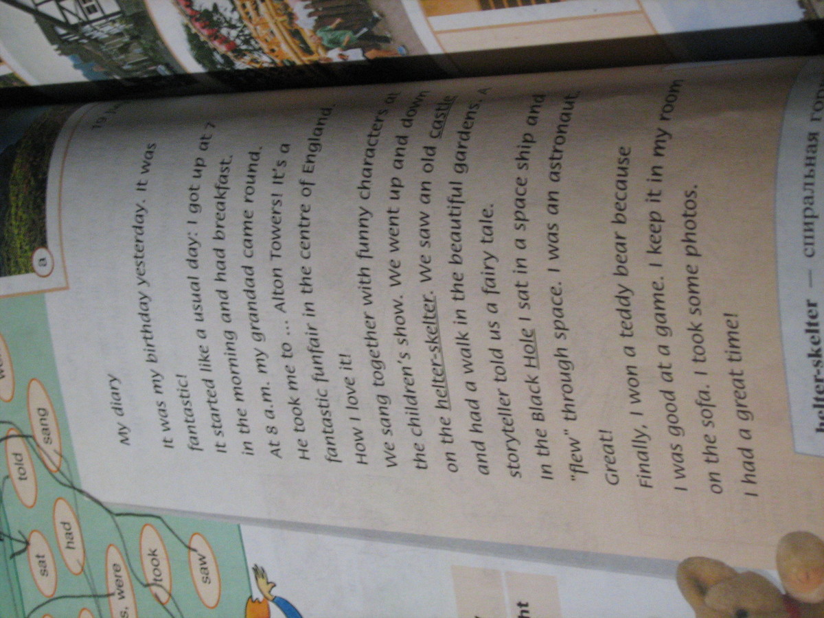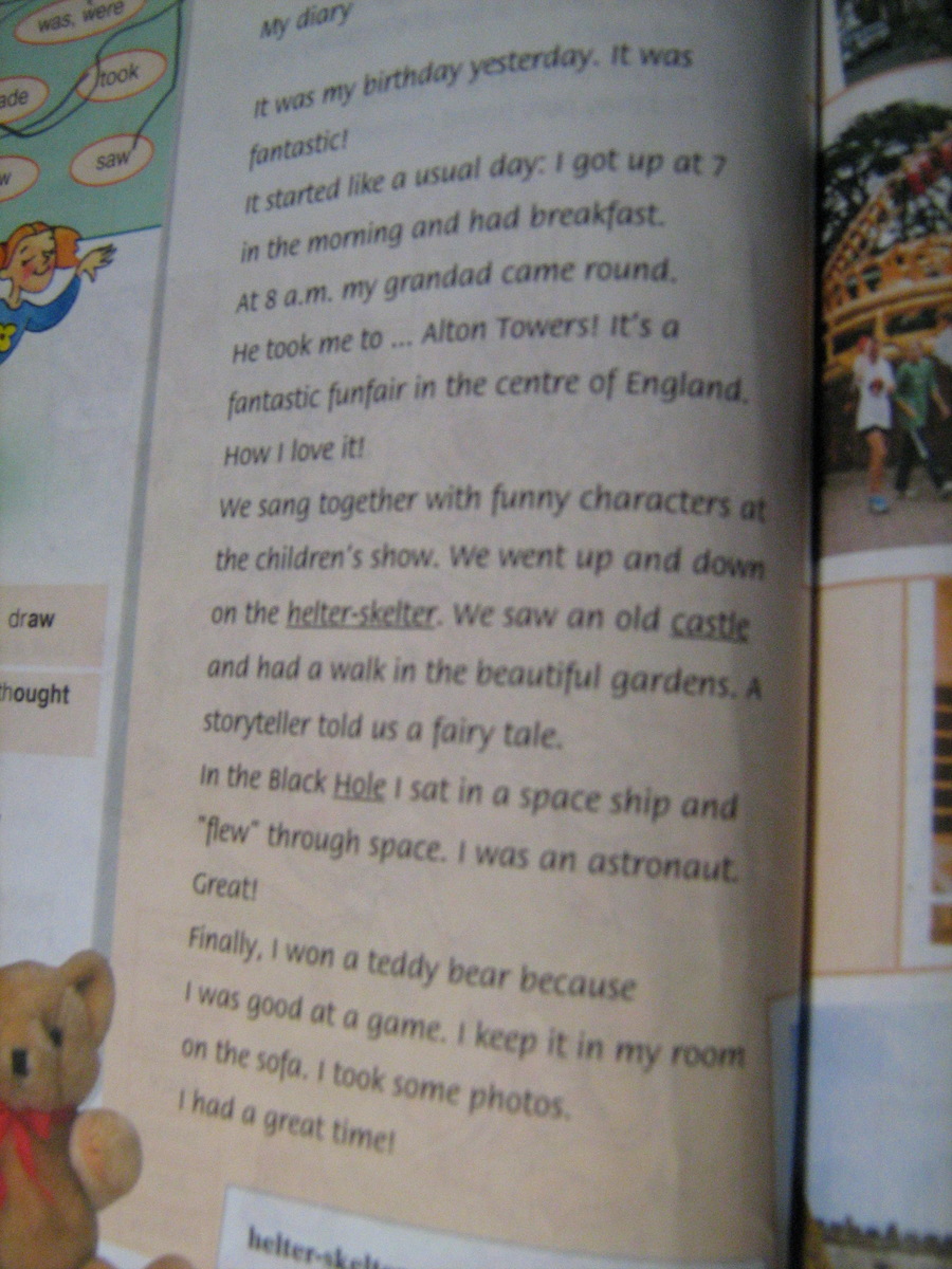 Я начал день по-обычному: я встал в 7 часов утра и позавтракал. В 8 часов дедушка заехал за мной. Он отвёз меня на Башню Алтона! Это прекрасный парк с аттракционами в центре Англии! Как я люблю егоЙ