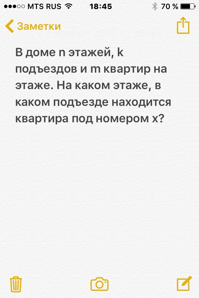 writeln('Искомая квартира находится в ',z,'-м подъезде на ',y,' этаже.');