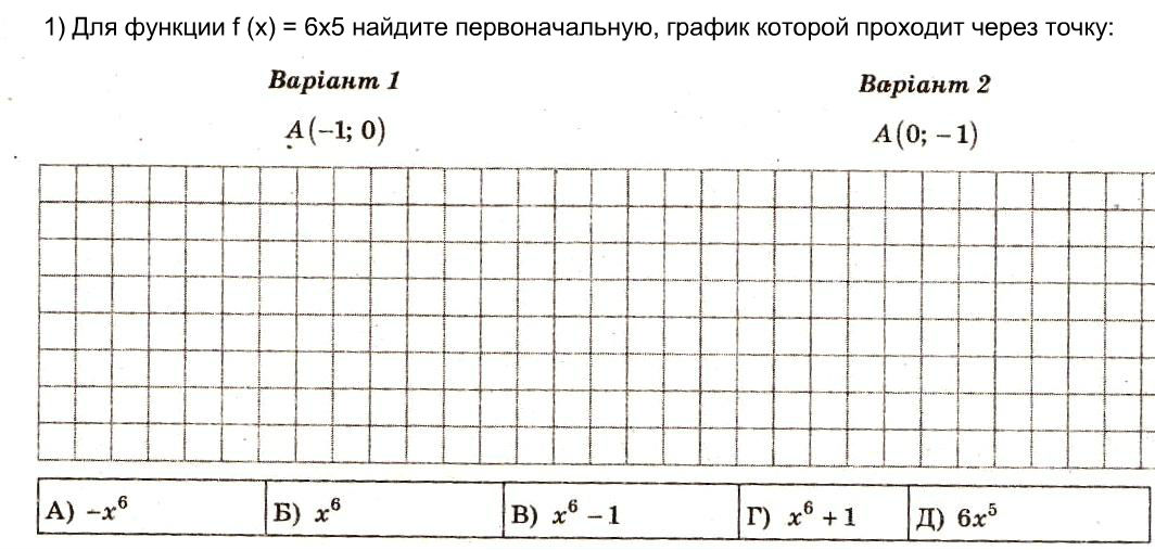 1) Для функции f (x) = 6х5 найдите первоначальную, график которой проходит через точку: