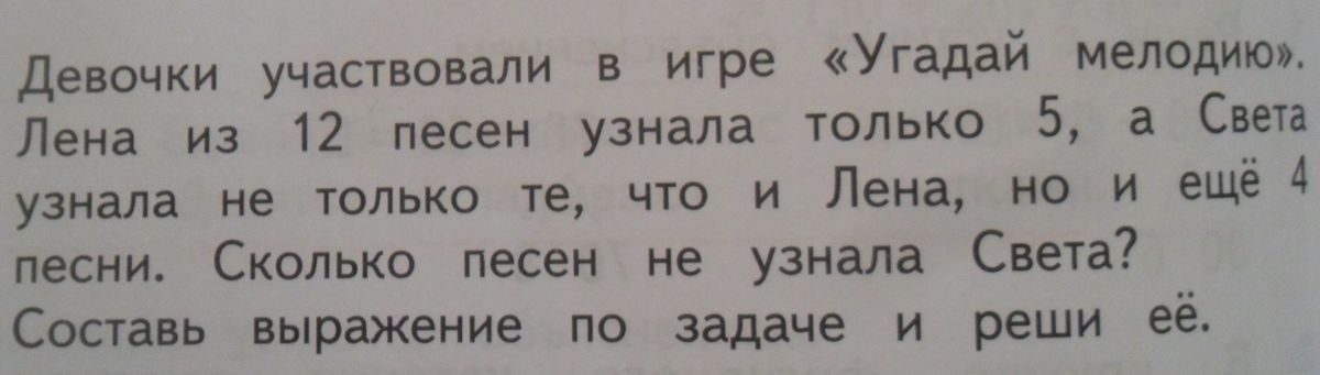 12-(5плюс4):3(п.)-не узнала Света.ОТВЕТ:3 песни не узнала Света