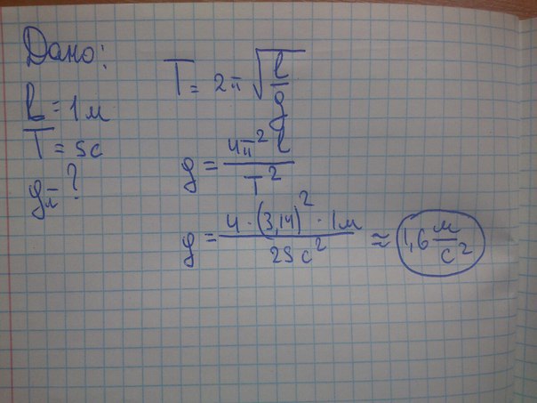 Чему равно ускорение свободного падения на Луне, если период колебаний математического маятника длиной 1м равен на Луне 5с?