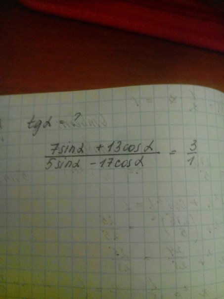 frac{7sin alpha +13cos alpha }{5sin alpha -17cos alpha } =frac{3}{1}\\frac{7sin alpha +13cos alpha }{5sin alpha -17cos}=[frac{:cos alpha }{:cos alpha }]=frac{7cdot frac{sin alpha }{cos alpha }+13}{5cdot frac{sin alpha }{cos alpha }-17}=frac{7cdot tg alpha +13}{5cdot tg alpha -17}=frac{3}{1}\\7tg alpha +13=3(5tg alpha -17)\\7tg alpha +13=15tg alpha -51\\8tg alpha =64\\tg alpha =8\\oo