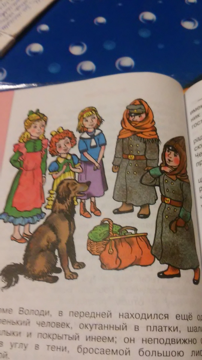 На этой картине я вижу героев рассказа Чука и Гека.Они еще в шубках,видно они только зашли домой. В доме их встречают девочки и пес.Все они смотрят друг на друга.