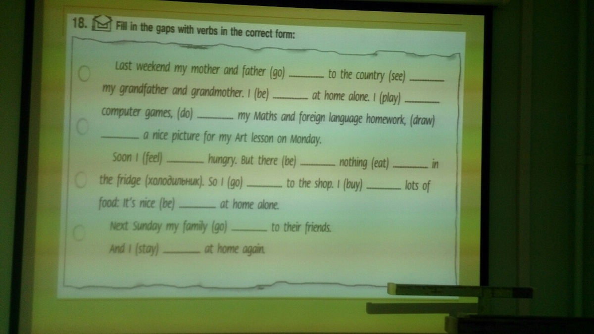 Last weekend my mother and my father went to the country to see my grandmother and grandfather. I was at home alone. I played the computer games, did my Maths and foreign language homework, drew a nice picture for my Art lesson on Monday. Soon I felt hungry. But there was nothing to eat in the fridge. So I went to the shop. I bought lots of food: it's nice to be at home alone. Next Sunday my family will go to their friends. And I shall stay at home again.