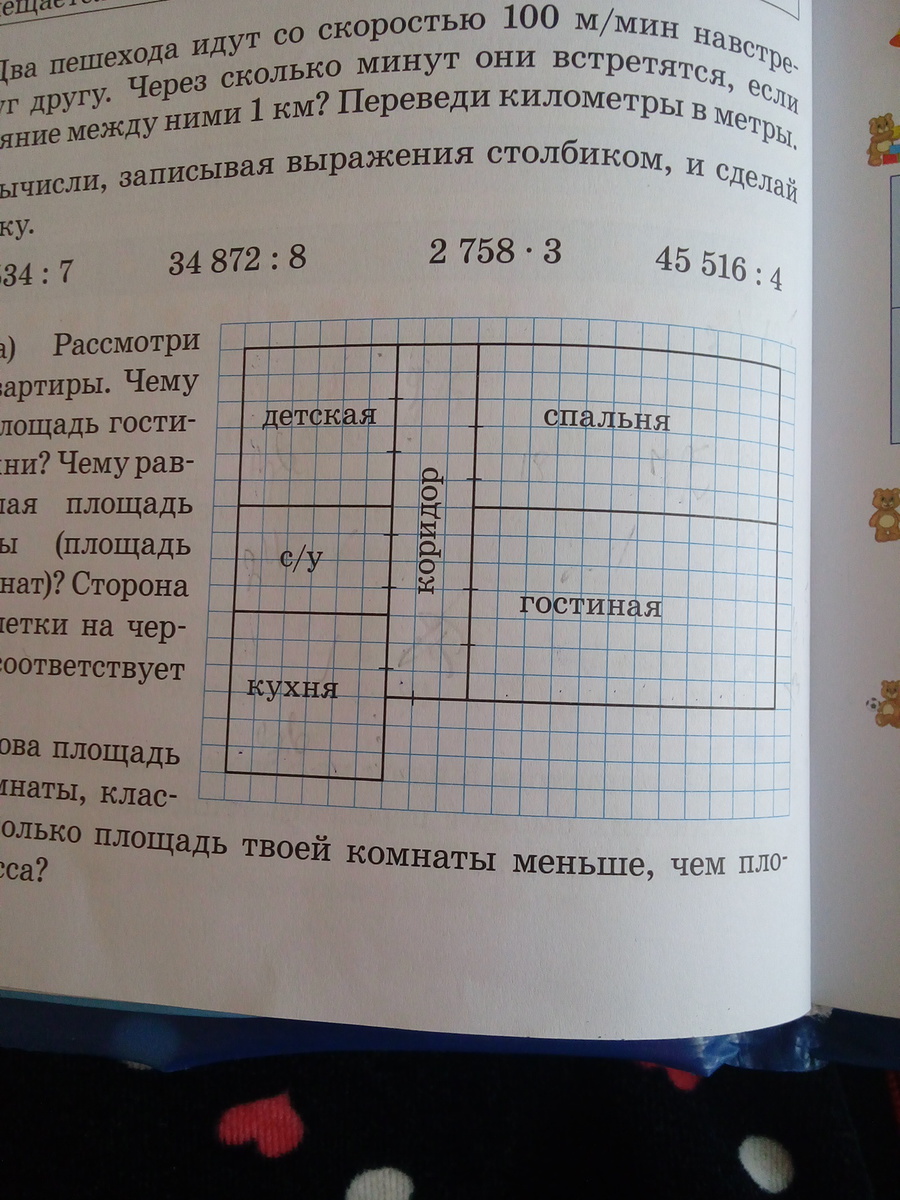 рассмотри план квартиры. Чему равна площадь гостиной , кухни? Чему равна жилая площадь квартиры (площадь всех комнат?). Сторона одной клетки на чертеже соответствует 50 см.