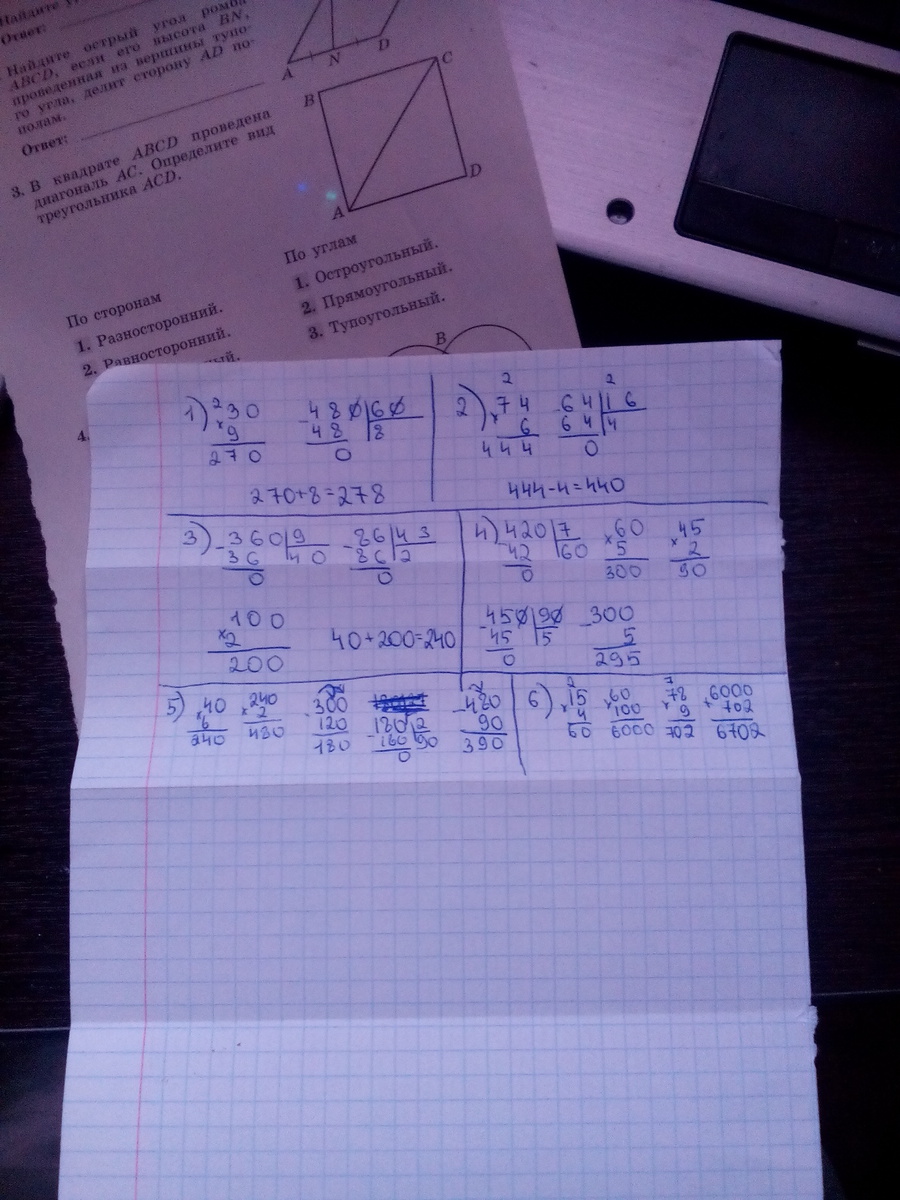 вычислите столбиком. 1)30×9 + 480 ÷ 60. 2) 74 × 6-64÷16 3) 360 ÷ 9 + 86 ÷ 43 × 100. 4) 420 ÷ 7 × 5-450 ÷ ( 45 × 2 ) 5) 2× ( 40 × 6 ) - ( 300-120 ) ÷ 2. 7)4× 15 × 100 + 78 × 9 помогите пожалуйста