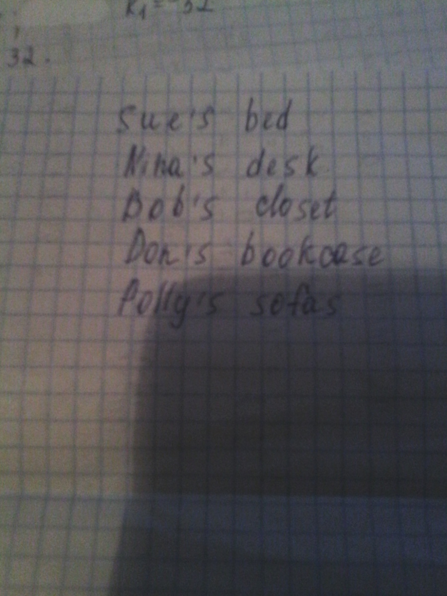 20 БАЛЛОВ как по английски будет-кровать Сью,парта Нины,шкаф Боба,книжный шкаф Дона,диваны Полли спасибо