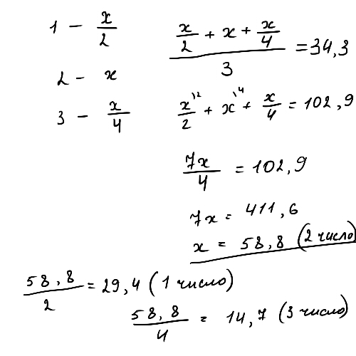 среднее арифметическое трёх чисел ровно 34,3. Одно из них в два раза меньше, чем вторае и в два раза больше, чем третье. Найди числа.