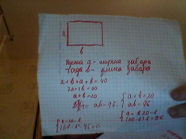 Прямоугольный участок земли обнесен забором,длина которого 40м.Площадь участка 96м в квадрате,Найдите длины сторон участка