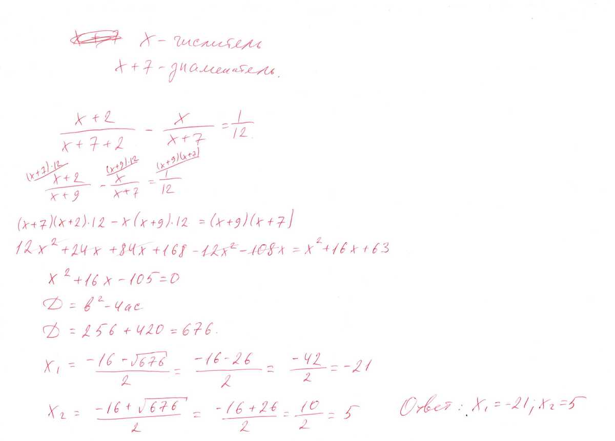 Числитель дроби на 7 меньше знаменателя. При увеличении числителя и знаменателя на 2 дробь увеличивается на одну двенадцатую. Найдите эту дробь. (нужно решить через х,с помощью уравнения) ПОМОГИТЕ!