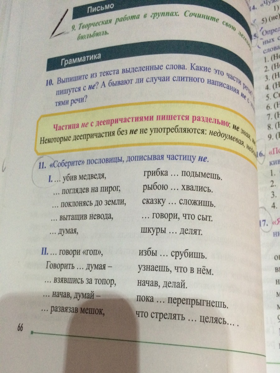 1Не убив медведя шкуры не делят2 Не поглядев на пирог не говори, что сыт 3 Не покланясь до земли грибка не подымешь4 Не вытащив невода, рыбою не хвались 5 Не думая сказку не сложишь(это 1 часть)