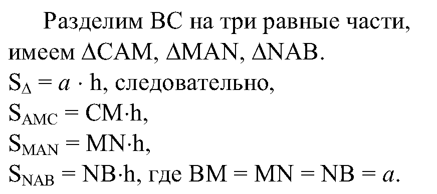 начертите треугольник abc . через вершину а проведите две прямые так, чтобы они разделили этот треугольник на три треугольника, имеющие равные площади. С Пояснением.